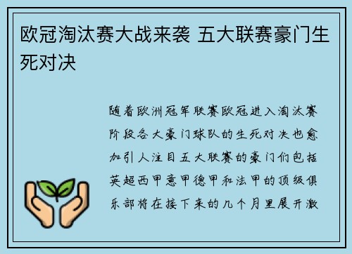 随着欧洲冠军联赛(欧冠)进入淘汰赛阶段,各大豪门球队的生死对决也愈加引人注目。五大联赛的豪门们,包括英超、西甲、意甲、德甲和法甲的顶级俱乐部,将在接下来的几个月里展开激烈争夺。每一场比赛都将关乎球队的...