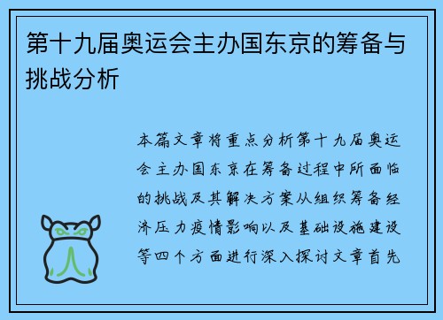 本篇文章将重点分析第十九届奥运会主办国东京在筹备过程中所面临的挑战及其解决方案。从组织筹备、经济压力、疫情影响以及基础设施建设等四个方面进行深入探讨。文章首先简要概括了东京举办奥运会的背景及其重要性,...